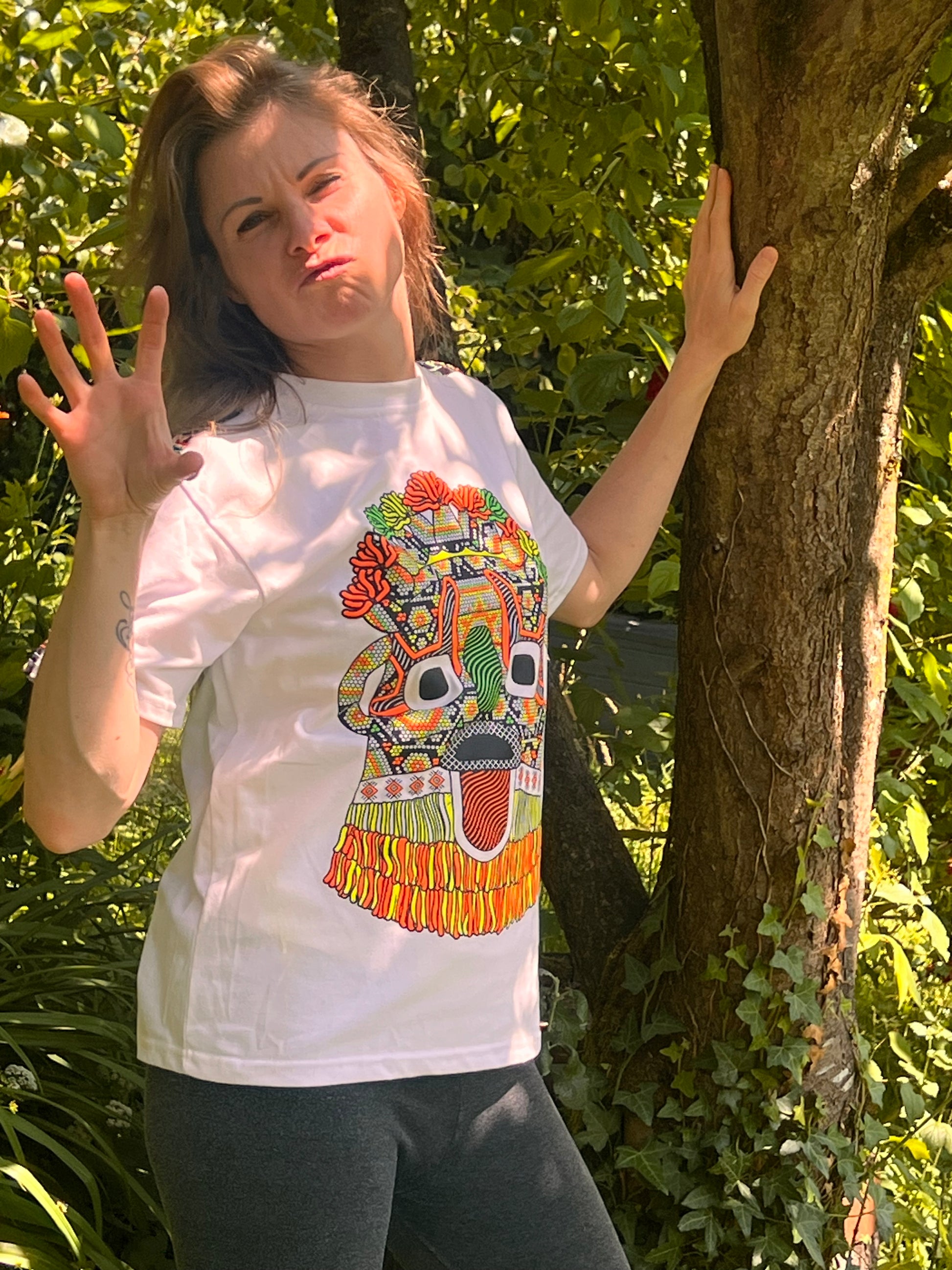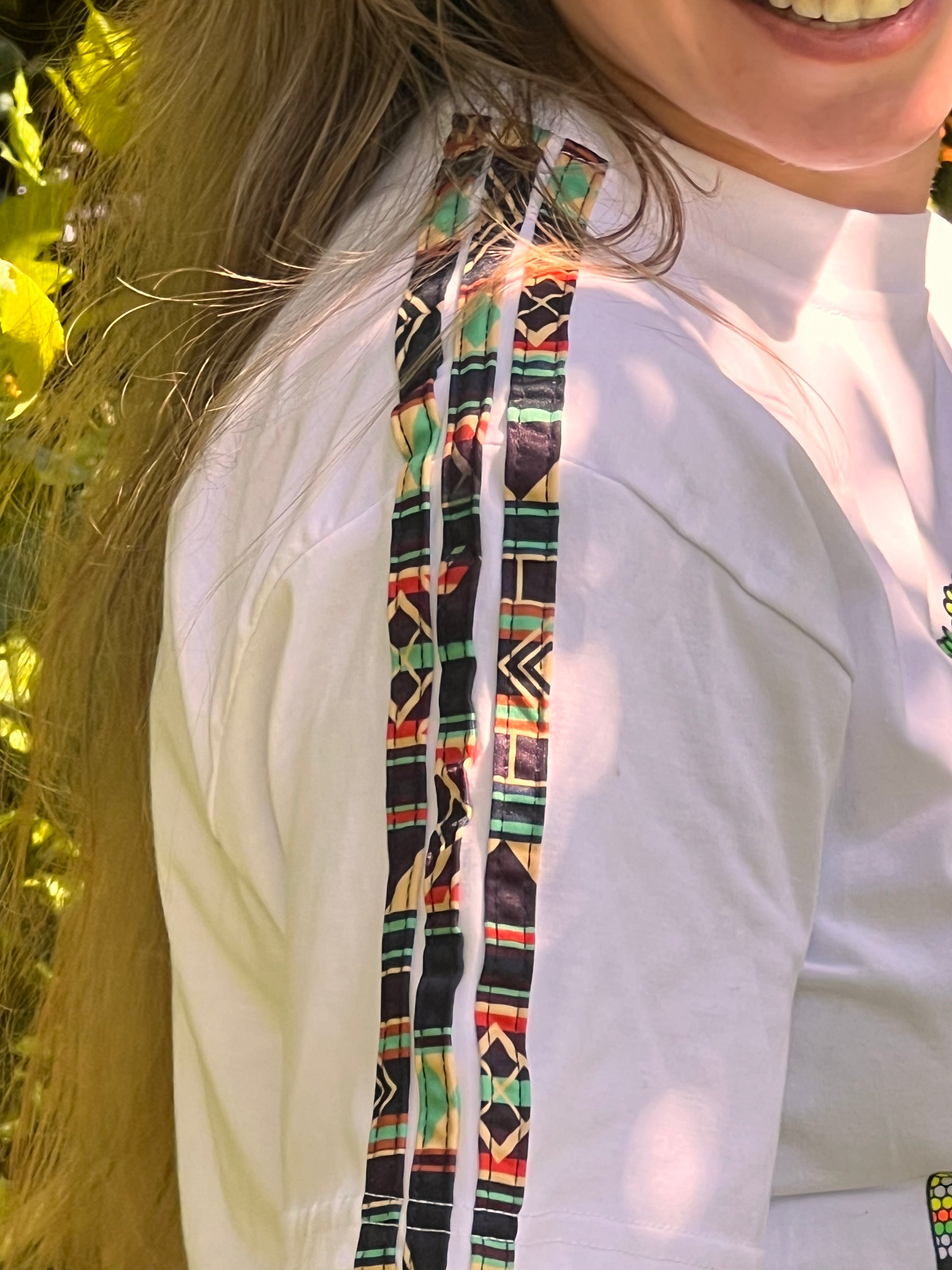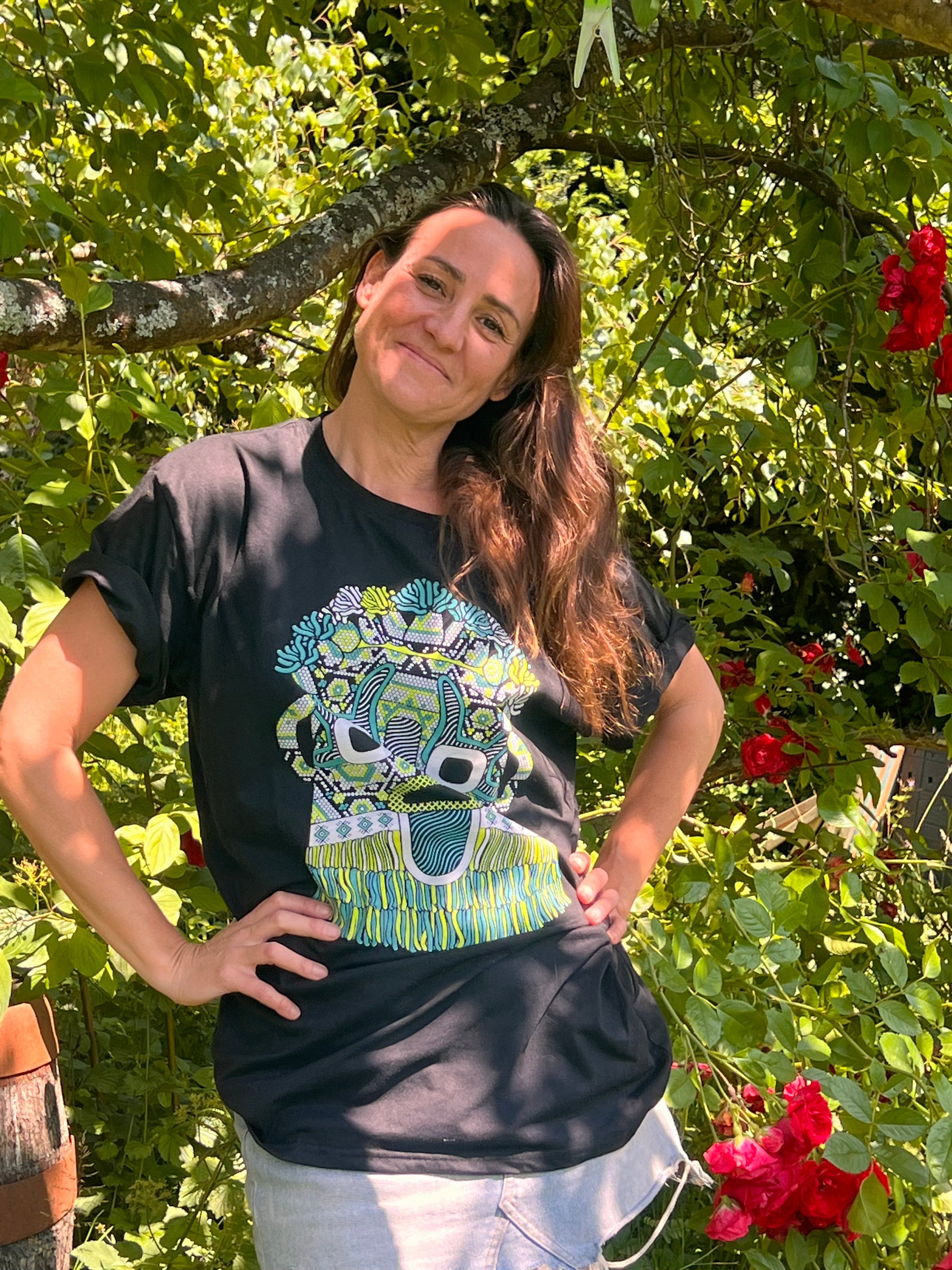 Schwarzes T-Shirt mit mehrfarbigem Kolibri- und Blumendruck.