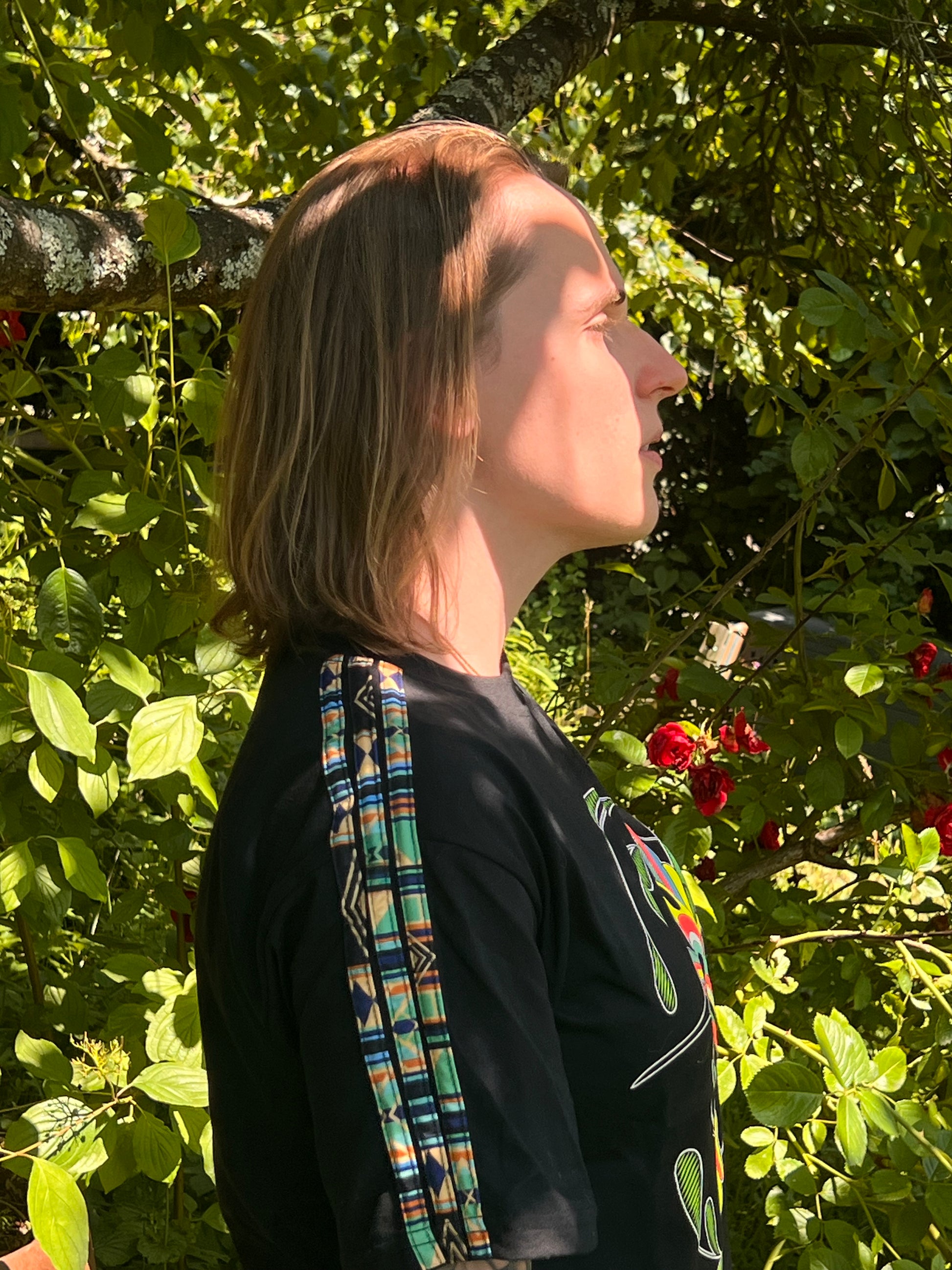 Schwarzes T-Shirt mit mehrfarbigem Kolibri- und Blumendruck.
