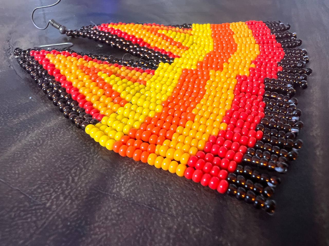 Aretes triangulares coloridos y alegres hechos a mano por mujeres Inga del Putumayo, Colombia.