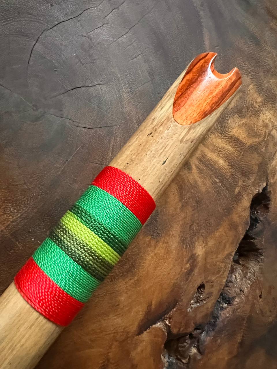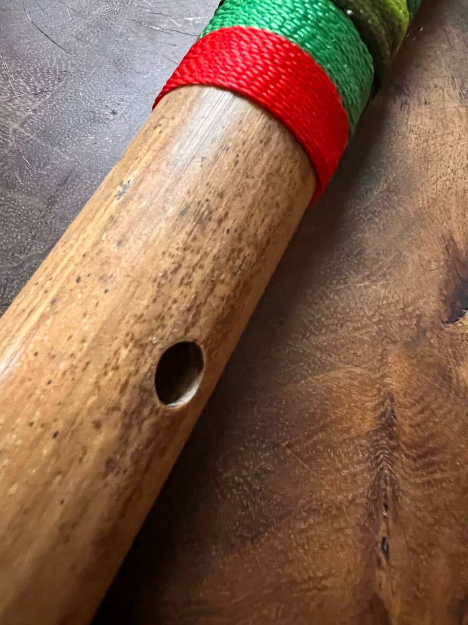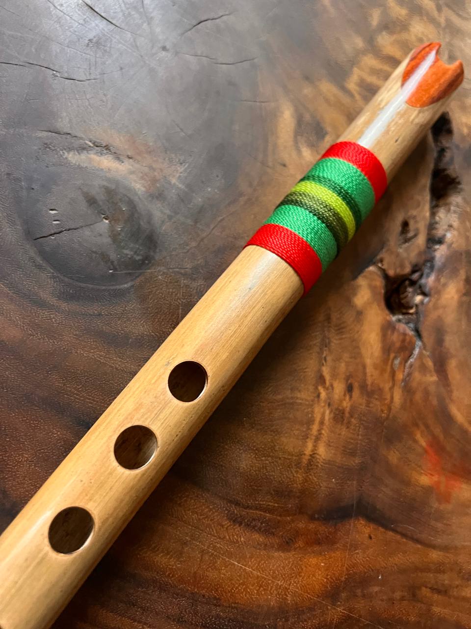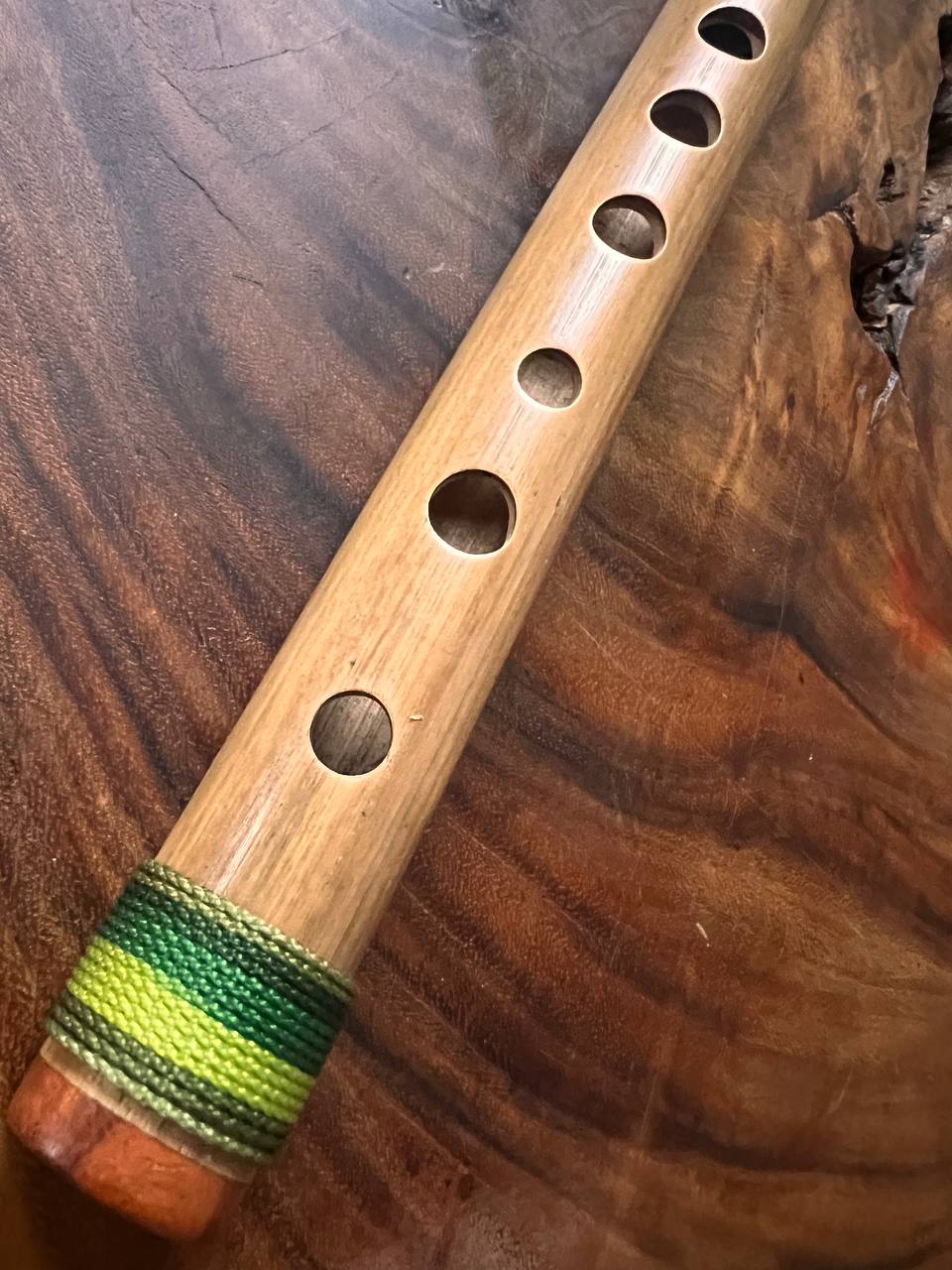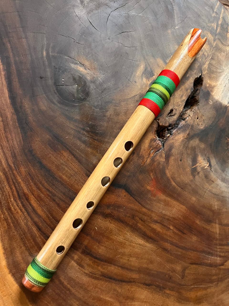 Quena afinada en Sol mayor , de tamaño mediano, hecha de bambú frío (tunda) de Sibundoy con incrustaciones de granadillo. Fabricada por Iván Zambrano en Mocoa, Putumayo, Colombia, en octubre de 2023.